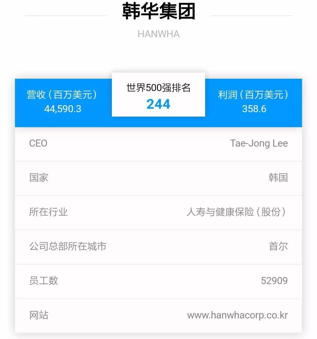 2018年7月20日,《财富》世界500强排行榜最新发布,韩华新能源母公司韩华集团凭借446亿美元总营收荣居第244位。回顾其历年排名,从2014年331位、2015年329位、2016年第277位至2017年第246位, 韩华已连续多年保持稳步提升的态势。