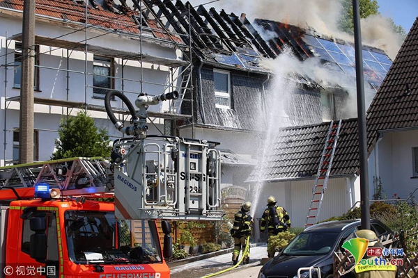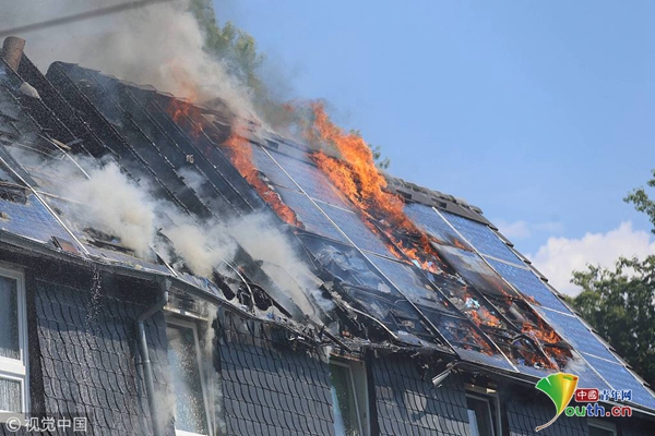 德国一处民宅太阳能板屋顶起火 整个屋顶烧成“骨架”