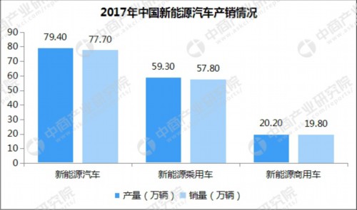 其中,2017年新能源乘用车产销量分别为59.3万辆和57.8万辆;新能源商用车产销量分别为20.2万辆和19.8万辆。