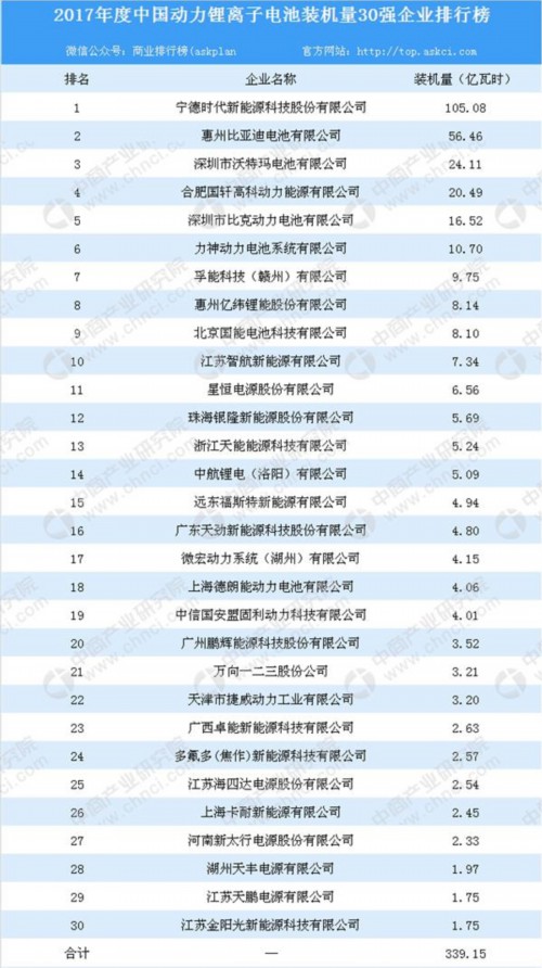 整体来看,2017年装机量排名前五的动力锂离子电池企业共计装机量为222.66亿瓦时,占锂离子电池装机量的60.3%。