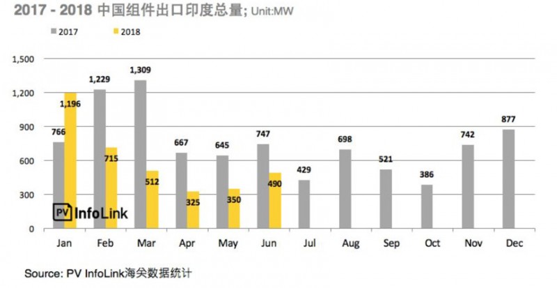 在印度方面,2018上半年出口总量因受贸易战影响,表现未如预期;较去年上半有33%的衰减,然而印度仍是中国组件最主要的出口市场,上半年出口总量达3.6GW。而印度财政部税务局(The Ministry of Finance,Department of Revenue)于2018.7.30日晚间正式宣布并确认即日起对中国、马来西亚及其他已开发国家的太阳能电池(无论是否封装为组件)征收25%的保障性关税,虽说近期中国整体供应链成本因受531影响已有明显下降,若加上25%防卫性关税,则整体价格约等同于近期印度本土制造之组件价格,项目及电站建设成本随之增加,既有安装规划将受到影响,故PV Infolink将今年印度市场需求预估下修至7 – 9GW。