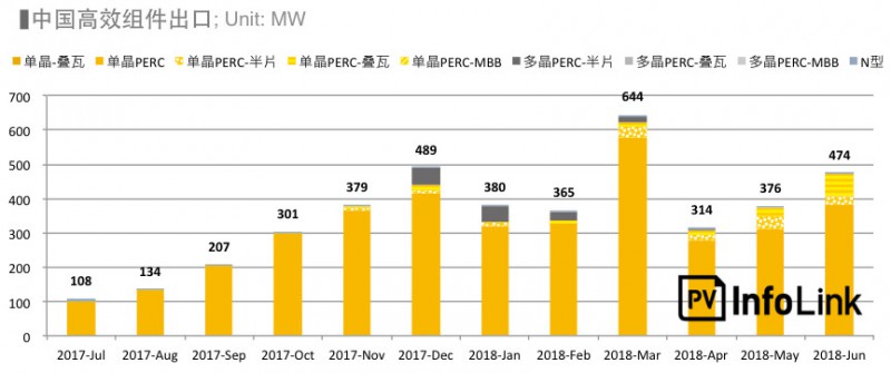 自2017年下半年起,中国每月高效组件出口量持续稳定增加,2018年虽需求有所起落,但几乎每月都有350MW以上的出口量,三月更是创下单月644MW的出口纪录,2018上半年中国高效组件累计出口量近2.5GW,其中4.5%为极高效组件(72pcs370W以上、60pcs 310W以上)。