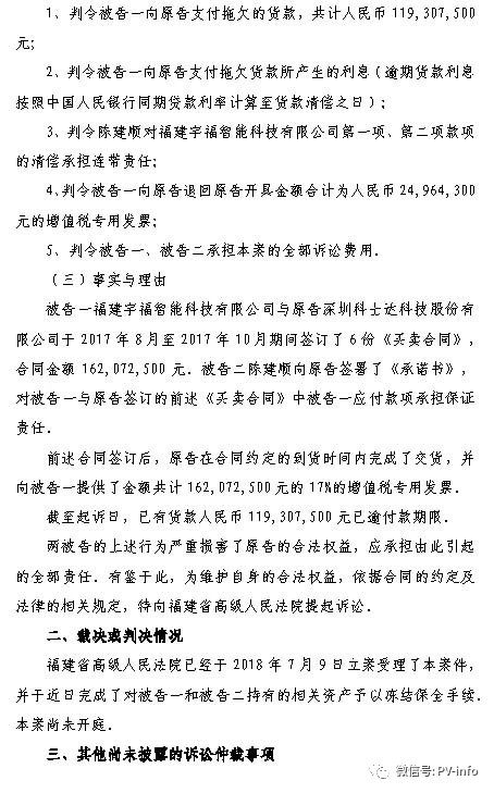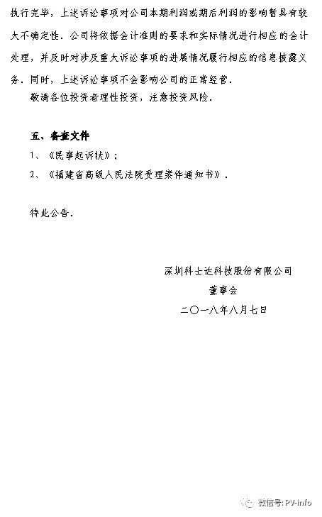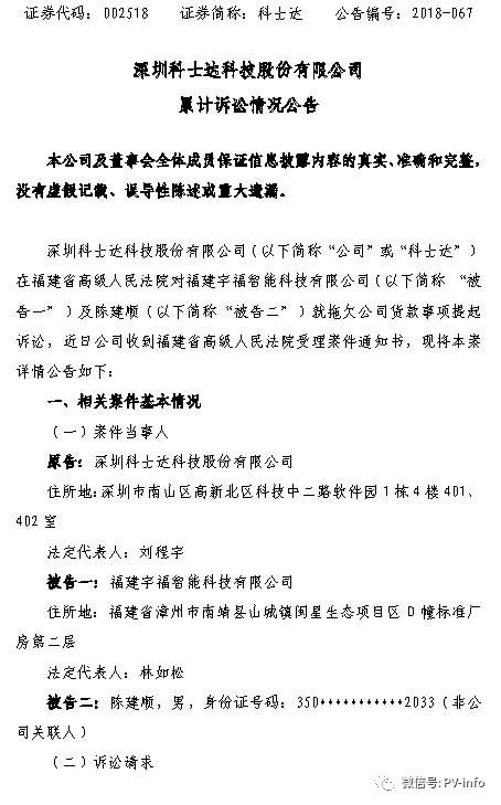 2018年8月6日,深圳科士达科技股份有限公司发布《累计诉讼情况公告》,公告指出:深圳科士达科技股份有限公司(以下简称“公司”或“科士达”)在福建省高级人民法院对福建宇福智能科技有限公司(以下简称 “被告一”)及陈建顺(以下简称“被告二”)就拖欠公司货款事项提起诉讼,近日公司收到福建省高级人民法院受理案件通知书。