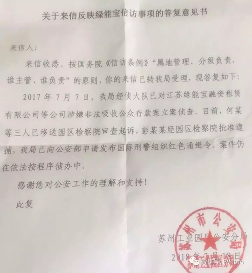日前,绿能宝涉嫌非法吸收公众存款一案有了最新进展,何某等三人已移送园区检察院审查起诉,彭某某经园区检察院批准逮捕。