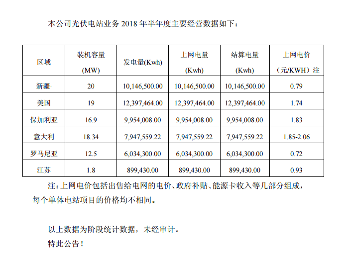 本公司光伏电站业务2018年半年度主要经营数据如下: