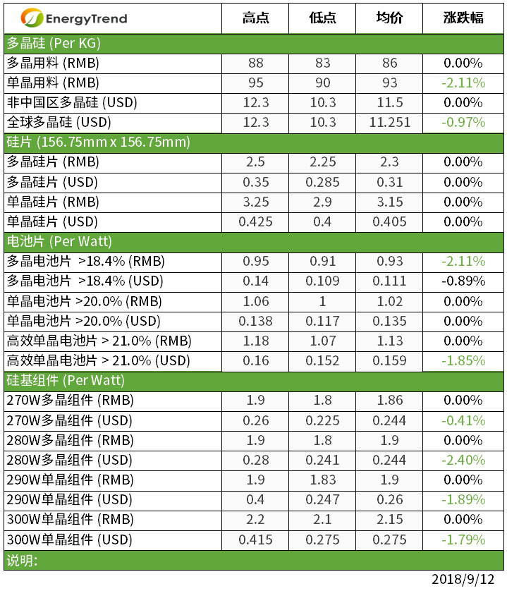 本周大陆国内组件虽需求不振,但受成本制约,价格大致持稳。高效单晶组件已开始有询单,估计与第四季领跑者项目的建设有关。目前中国国内常规多晶价格维持RMB1.80-1.90/W,高效多晶也是在RMB1.80-1.90/W的价格。常规单晶则是RMB1.83-1.90/W的价位,高效单晶在RMB2.10-2.20/W,均价在2.15RMB/W。