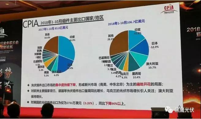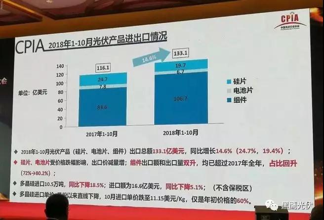 根据中国光伏行业协会数据,2018年1—10月,光伏进出口情况呈现增长态势,增长率14.6%;从去年开始出口额第一次走出负增长。硅片和电池片表现出价减量增。组件出口额、出口量均上升。组件出口额回升80%,9月份就已经超过去年全年出口额。