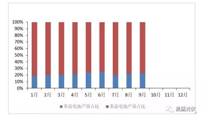 下图为2018年1-9月单晶、多晶电池片产量占比。从图中可以看到,2018前9月,单晶电池产量占比基本处于20%出头,6月占比最高,达到26%;1月和7月占比相对较低。