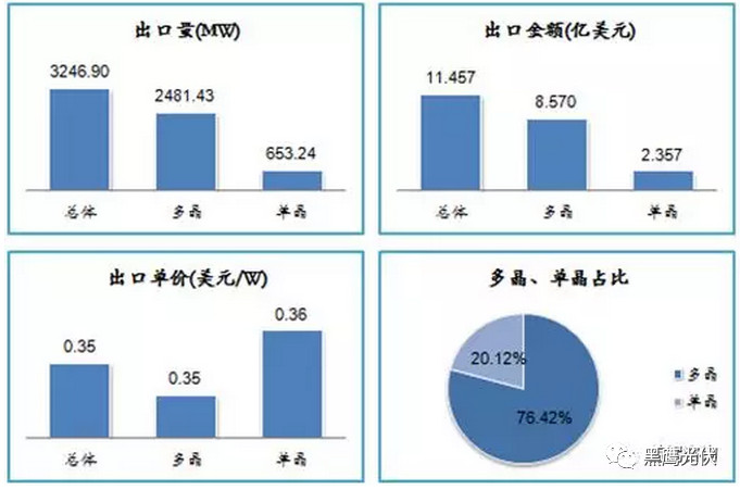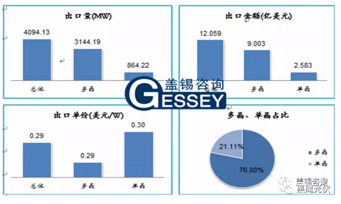 盖锡咨询的出口数据则显示,2018年1月份中国光伏组件出口量为3.24690GW,其中多晶出口占比为76.42%,单晶为20.12%。
