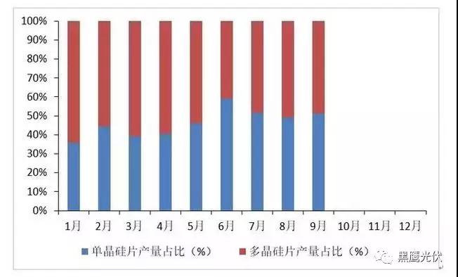 下图则为2018年1-9月单晶、多晶硅片产量占比。从下图可以看出,2018前9个月,单晶硅片产量占比超过了45%。相比电池和组件产量占比,单晶在硅片环节的产量占比相对要高不少,这也与黑鹰光伏之前统计的的单晶硅片库存较高的结论是吻合的。