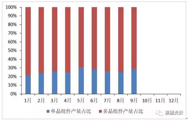 下图为2018年1-9月单晶和多晶组件产量各自占比。从图中可以看到,2018前9个月,单晶组件占比基本处于20%—30%之间,其中5月占比最高,达到30%;1月占比最低,仅20%出头。