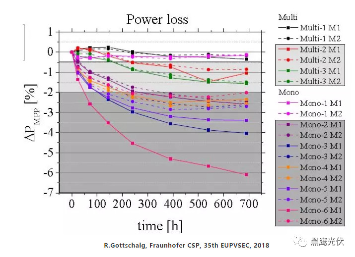 事实上,9月在比利时举行的2018年度PVSEC会议上,欧洲最大的太阳能测试中心——德国Fraunhofer光伏晶硅研究中心发布了一份研究报告,详细介绍了单多晶PERC组件的LeTID,即‘光照和高温导致的衰减’测试结果。
