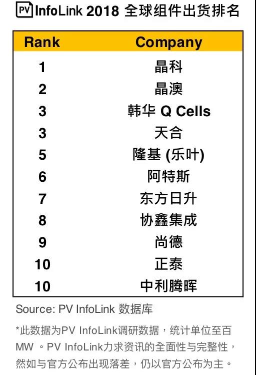 今日,PVInfoLink发布2018年组件出货量排名,根据PVInfoLink统计,2018年全球组件出货量前三名为晶科、晶澳、韩华Q-Cells与天合光能(并列第三)。