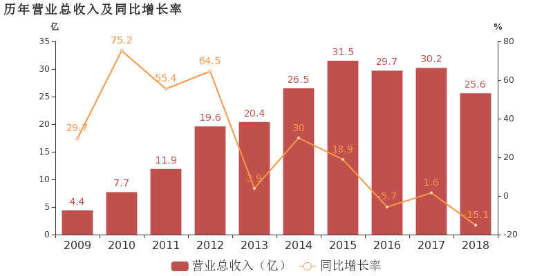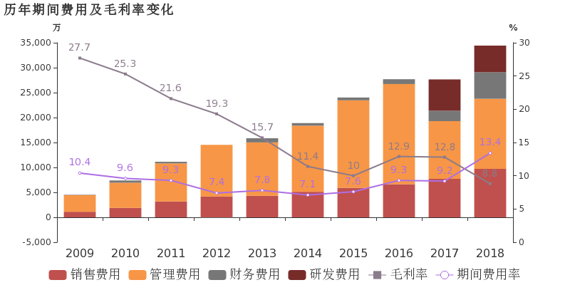 公司2018年期间费用率为13.4%,较上年升高4.3%,对公司业绩形成拖累。期间费用合计达3.4亿,同比上升24.5%。其中销售费用为9713.7万,同比上升25.9%;管理费用为1.4亿,同比上升21.5%;财务费用为5322.2万,同比上升155.1%;研发费用为5337万,同比下降15%。营业成本23.4亿,同比下降11.2%,低于营业收入15.1%的下降速度,毛利率下降4%。经营性现金流由1883.3万下降至-2.5亿,同比下降1442.6%。公司本期研发投入为5337万,同比下降15%。