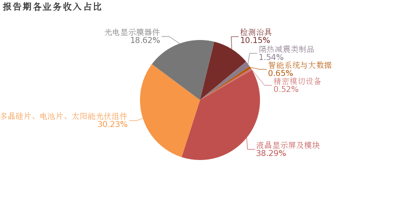 从业务结构来看,“液晶显示屏及模块”、“多晶硅片、电池片、太阳能光伏组件”是企业营业收入的主要来源。具体而言, “液晶显示屏及模块”营业收入为9.2亿,营收占比为38.3%。“多晶硅片、电池片、太阳能光伏组件”营业收入为7.2亿,营收占比为30.2%。“光电显示膜器件”营业收入为4.5亿,营收占比为18.6%。