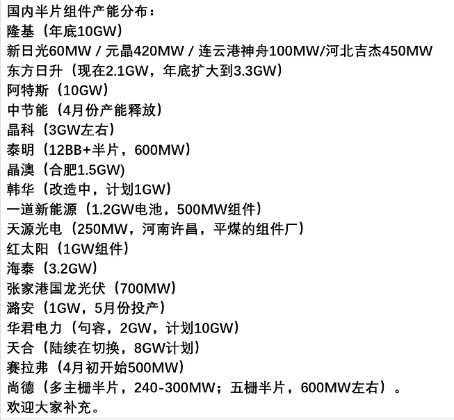 读者补充台湾半片组件产能:URE 联合再生能源(新日光)250MW; 元晶420MW ; 友达200MW