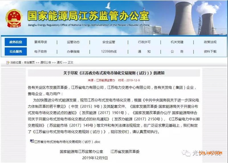 2019年12月9日,江苏能源监管办、江苏省发展改革委制定并发布《江苏省分布式发电市场化交易规则(试行)》(文件原文见附件),要求各有关企业和部门认真贯彻执行,进一步规范江苏分布式发电市场化交易,加快推进分布式能源发展。