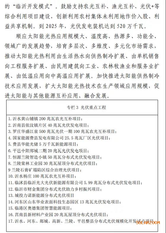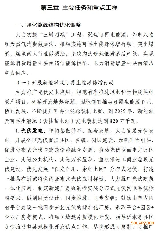近日,临沂市发布《能源发展“十四五”规划(征求意见稿)》。《规划》提出,大力推广光伏发电应用,规范有序推进风电和生物质热电联产项目,到 2025年,新能源及可再生能源(含抽蓄电站)发电装机达到 820 万千瓦,其中光伏发电装机达到 520 万千瓦。