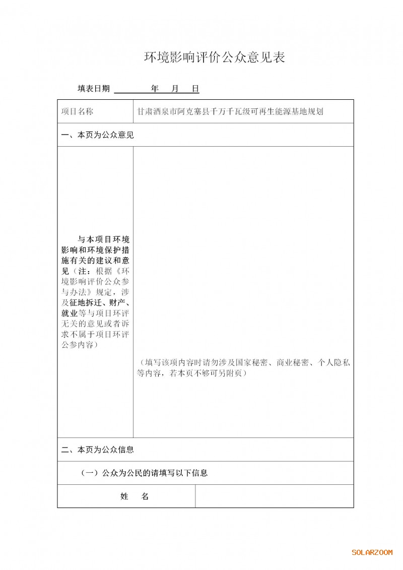 根据《环境影响评价公众参与办法》,现对甘肃酒泉市阿克塞县千万千瓦级可再生能源基地规划环境影响评价进行公众参与调查。