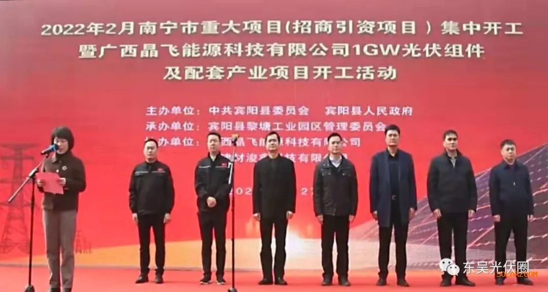 近日,南宁市宾阳县黎塘镇宾州产业园举行了2022年南宁市重大项目集中开工暨广西晶飞能源科技有限公司1GW光伏组件及配套产业项目开工活动。县委书记施杰、县长梁展凡、县人大常委会主任罗宏周、县政协主席麦阳明等县处级领导参加此次开工活动。