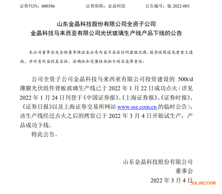 金晶科技(600586.SH)发布公告,公司全资子公司金晶科技马来西亚有限公司投资建设的500t/d薄膜光伏组件背板玻璃生产线已于2022年1月22日成功点火,该生产线经过点火之后的烤窑已于2022年3月4日开始试生产,产品成功下线。