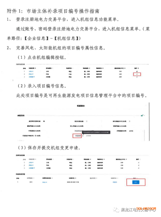 1.已经在黑龙江电力交易平台已经注册过的风电、光伏等新能源发电企业,请登陆黑龙江电力交易平台(新平台),于3月11日12时前补充录入新能源机组对应国家能源局“可再生能源发电项目信息管理平台”中的项目编号,特别是已经参与绿色电力试点的发电项目。具体操作步骤参考附件。