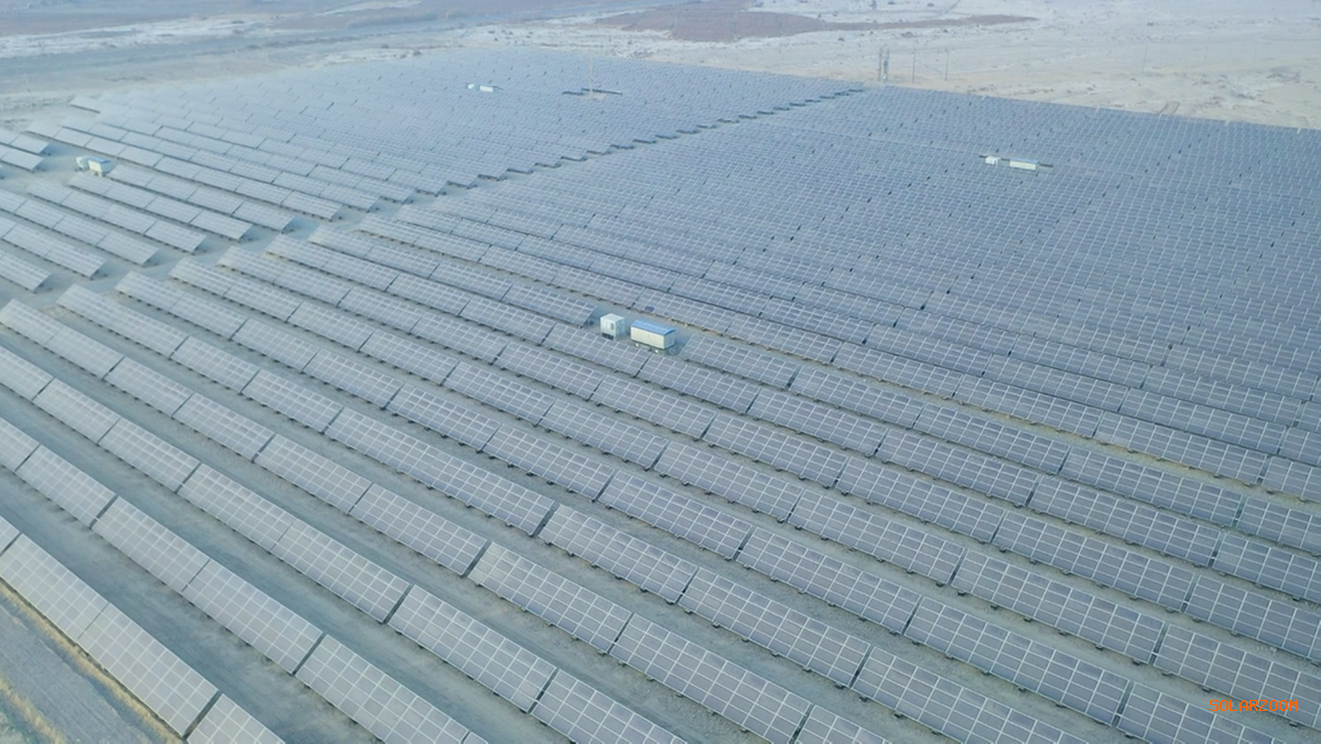 新疆喀什地区莎车县光伏产业园国家电投莎车100兆瓦光伏并网发电和储能设施项目建设现场。