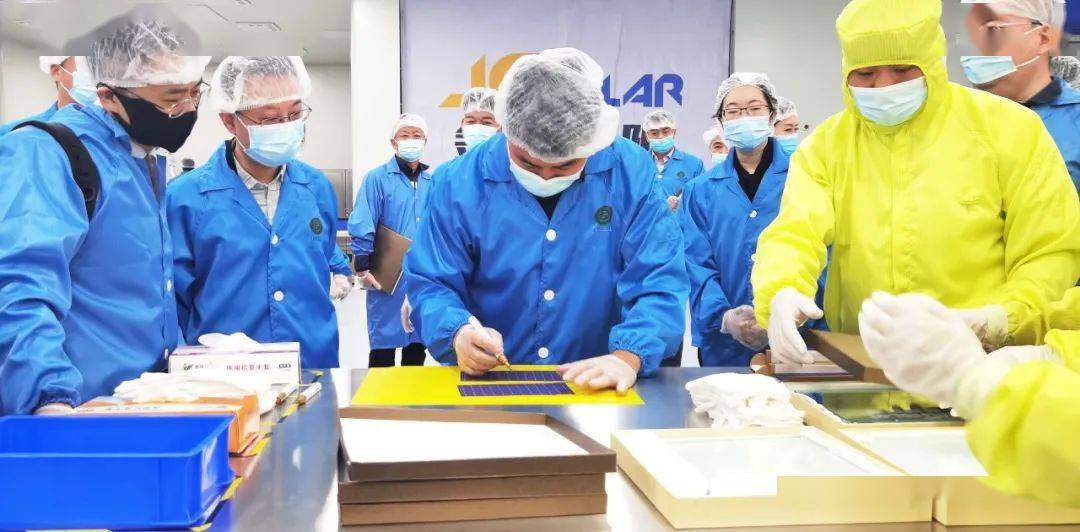 欧昊集团董事长张栋梁先生在210大尺寸异质结首片下线电池上签字留念