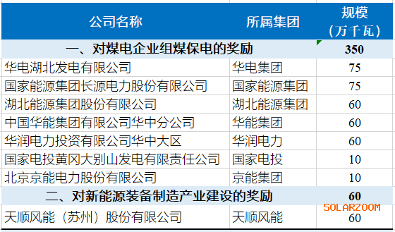 其中,组煤保电、新能源设备制造产业奖励指标的具体项目分配如下表所示。