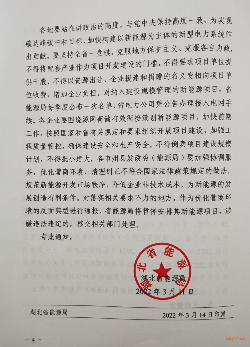 3月14日,湖北省能源局下发《关于落实相关政策推进风电、 光伏发电开发建设有关事项的通知》。文件给予四类新能源项目指标,总规模738万千瓦,包括:
