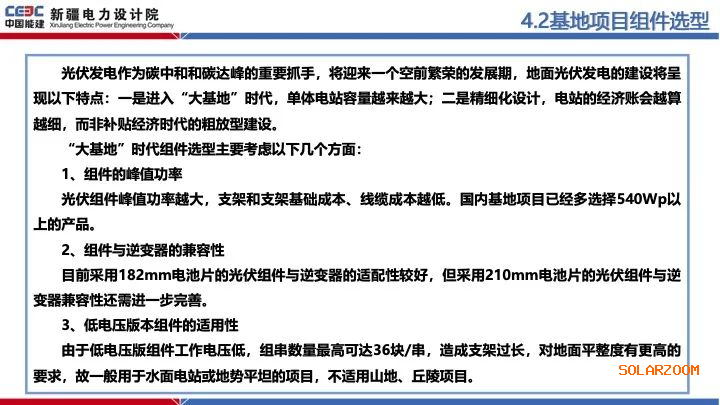 中国能建新疆电力设计院表示,“大基地”时代组件选型主要考虑以下几个方面: