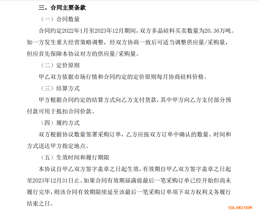 隆基股份(601012.SH)3月21日公告,根据公司与通威股份有限公司(“通威股份”)于2020年9月25日签订的《合作协议》,公司已与通威股份建立了长期稳定的多晶硅料供需合作意向。在此基础上,为保障公司多晶硅料的稳定供应,2022年3月21日,公司8家子公司与通威股份的4家子公司签订多晶硅料长单采购协议,根据协议,双方2022年1月至2023年12月期间多晶硅料交易数量为20.36万吨。