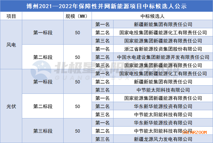 近日,新疆博州2021~2022年保障性并网新能源项目风电第一、二标段;光伏第三、四、五标段于2022年3月21日上午11:00(北京时间)在博州公共资源交易中心三楼开标一室准时开标。现将中标候选人情况公示如下: