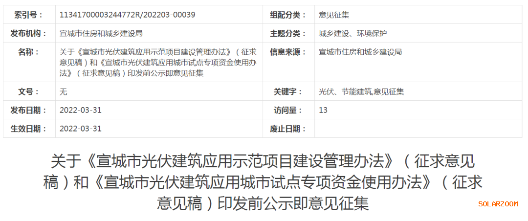 3月31日,宣城住建局官网发布“关于《宣城市光伏建筑应用示范项目建设管理办法》(征求意见稿)和《宣城市光伏建筑应用城市试点专项资金使用办法》(征求意见稿)印发前公示即意见征集”。