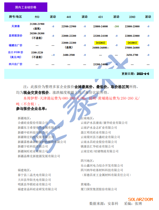 安泰科观点:目前,工业硅价格已接近硅厂生产成本,工厂挺价意愿较为强烈。但近期国内疫情形势较为严峻,导致交通运输不畅,工厂库存增加,同时下游需求一般,短期内工业硅市场预估仍处于震荡调整阶段。