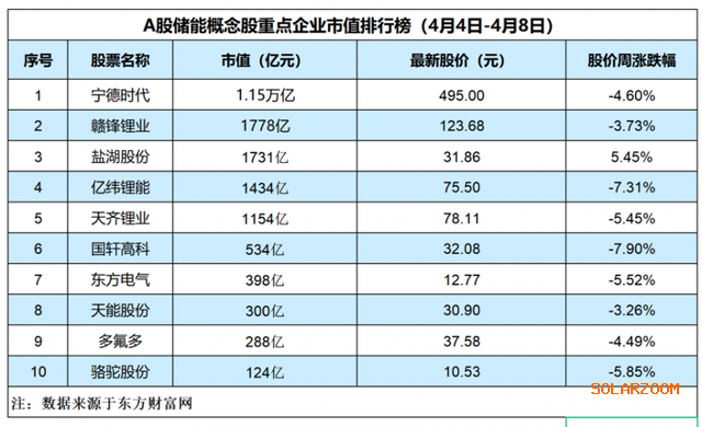 正值春暖花开之际,储能概念板块却异常清冷,板块已连续六周下跌。本周(4月6日-4月8日),东方财富储能概念板块继续延续跌势,周内多个交易日板块出现下探后拉。《华夏时报》记者重点监测的10家企业中,仅有盐湖股份1家上涨,其余9家全部下跌。宁德时代股价更是跌破500元大关,为495元每股,市值蒸发近百亿。