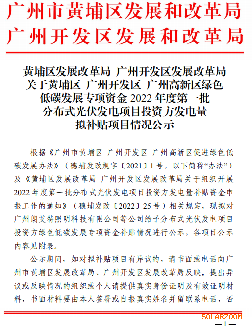 4月11日,黄埔区发展改革局 广州开发区发展改革局发布广州高新区绿色低碳发展专项资金2022年度第一批分布式光伏发电项目投资方发电量拟补贴项目情况公示,公示时间4月11-4月15日。文件指出,对分布式光伏发电的项目投资方按照发电量给予补贴,补贴标准为0.15元/千瓦时[应用方(屋顶方)为非公共机构的]、0.3元/千瓦时[应用方(屋顶方)为公共机构的]。单个项目最高享受补贴时间为5年,补贴时间范围在本办法有效期内。由项目投资方于项目并网后在线持续运行6个月以上后提出申请。