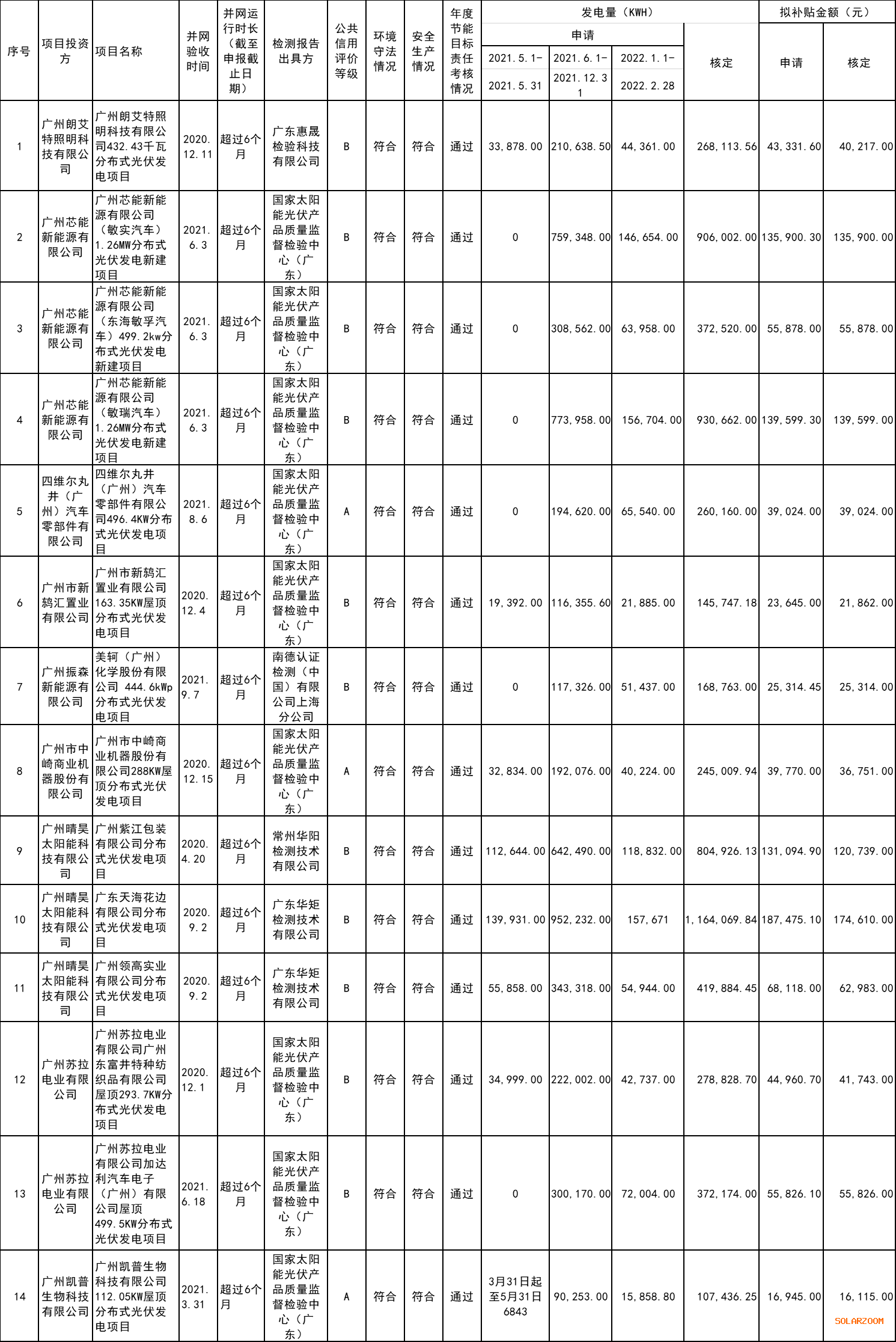 电量核定说明:《办法》从2021年5月20日起生效,5月份有效补贴日期为12天。区供电局反馈无法提供5月20日起的发电量,只能提供全月份的,故按平均法确定5月20日-31日期间的发电量,即补贴发电量=5月份全月发电量/31*12。另序号14,2021年5月20-31日期间应补贴电量按电量所属时间段平均核算。