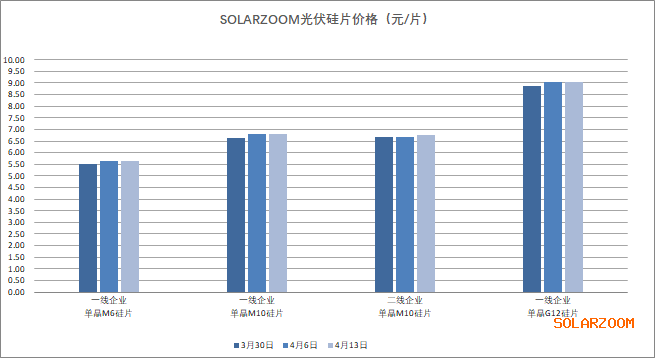 继清明节前一家龙头硅片企业上调单晶硅片价格后,本周国内又一龙头上调了单晶M10硅片的价格,单晶M10 165μm硅片价格上涨至6.82元/片,相比其他硅片厂商当前的价格不高,当前其他硅片厂商包括二线硅片厂商的单晶M10 160μm硅片价格在6.78-6.79元/片区间(165μm厚度的硅片价格高0.05元/片),单晶G12 160μm硅片价格在9.05元/片左右,当前国内下游电池端对单晶硅片的需求不减反增,但受近期疫情的影响,部分硅片企业的切片端生产仍受到限制(暂未复产),同时叠加疫情反弹所带的物流运输不畅,到货不及时等问题,使得当前国内整体单晶硅片在给下游电池端的供给上仍是紧张中。
