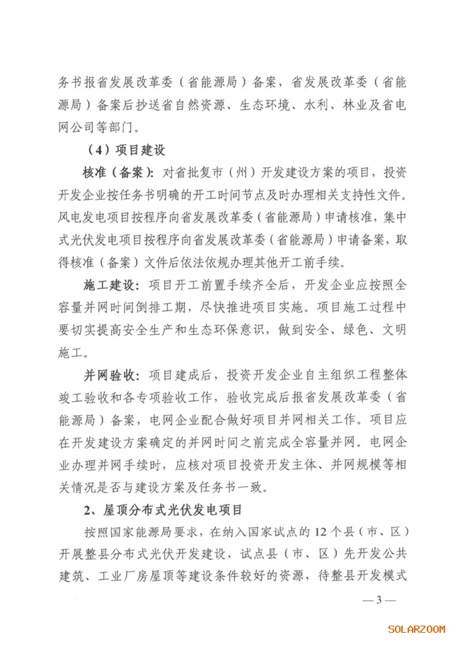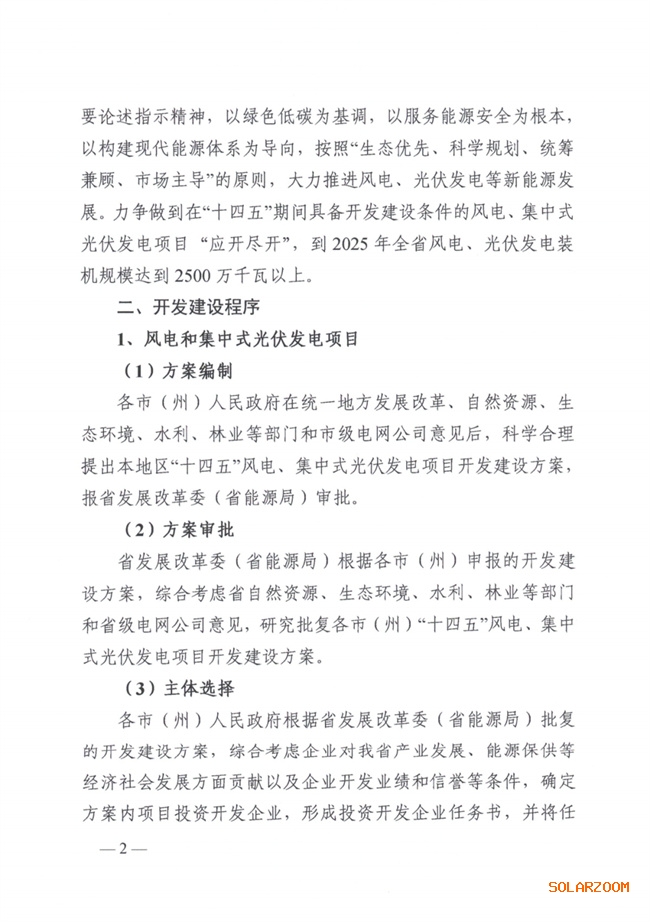 在开发程序上,文件要求各州市政府在统一发改委、自然资源、生态环境、水利、林业等部门和市级电网公司意见后,提出开发建设方案,报省发改委审批。开发建设方案中应明确项目名称、建设地点、建设规模、开发模式、开工及全容量并网时间等。项目建设可采取多能互补、源网荷储一体化等开发模式,促进新能源与传统能源协同发展。