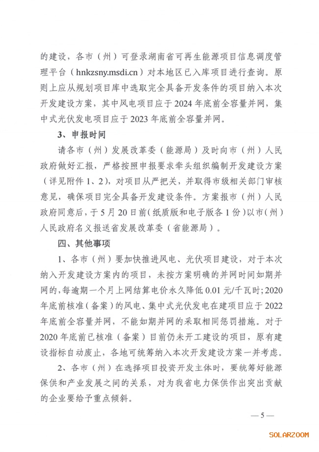 湖南省已完成全省“十四五”风、光资源详查和规划项目库的建设,原则上应从规划项目库中选取完全具备开发条件的项目纳入本次开发建设方案,其中风电项目应于2024年底前全容量并网,集中式光伏发电项目应于2023年底前全容量并网。