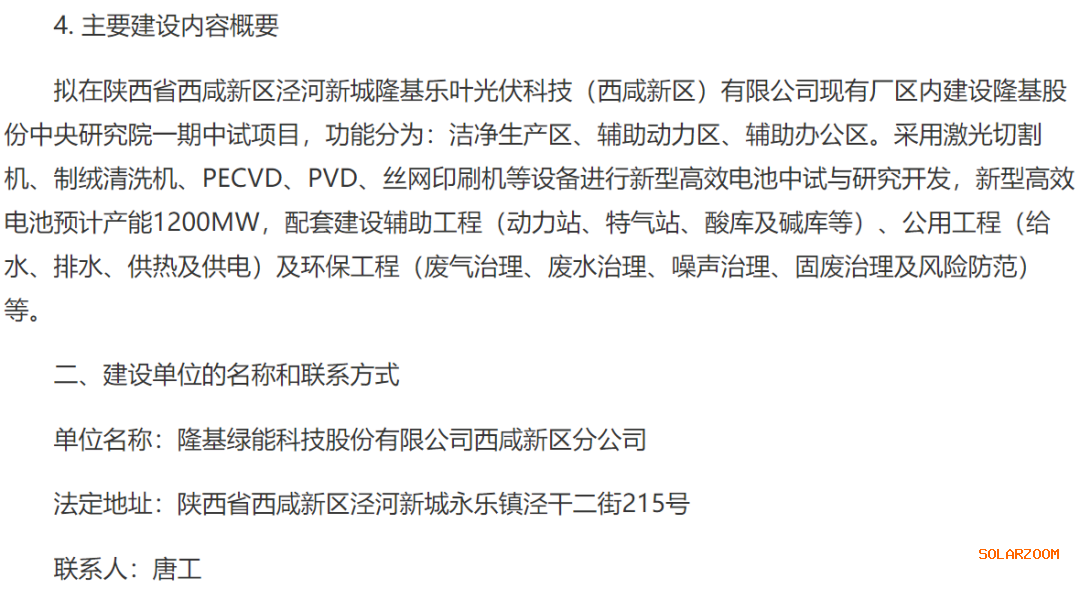 公告显示,隆基绿能科技股份有限公司西咸新区分公司将在“陕西省西咸新区泾河新城永乐镇北流村、南流村,原点大道以南,泾干三街以北,原点西一路以西,原点西二路以东”范围内建设1200MW/a项目,为隆基股份中央研究院一期中试项目。