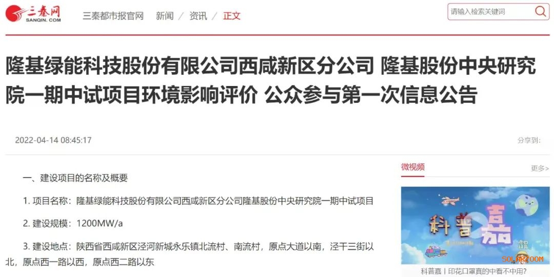 2022年4月14日,三秦都市报官网发布相关信息,隆基绿能科技股份有限公司西咸新区分公司隆基股份中央研究院一期中试项目环境影响评价公众参与第一次信息公告。