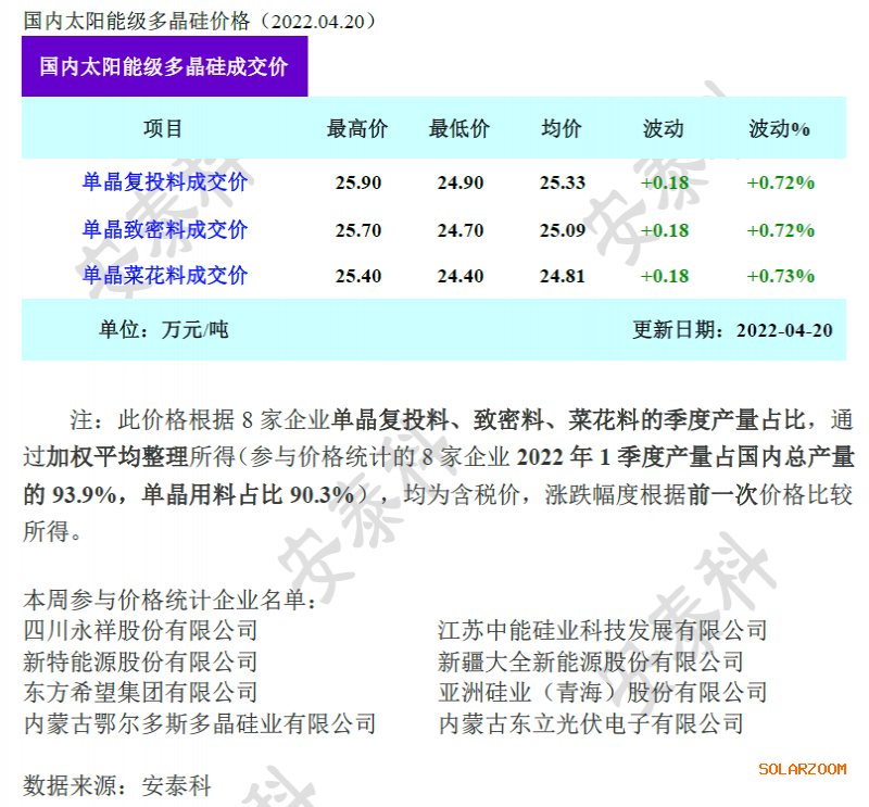 本周国内单晶复投料价格区间在24.9-25.9万元/吨,成交均价上涨至25.33万元/吨,周环比涨幅为0.72%;单晶致密料价格区间在24.7-25.7万元/吨,成交均价上涨至25.09万元/吨,周环比涨幅为0.72%。