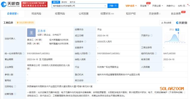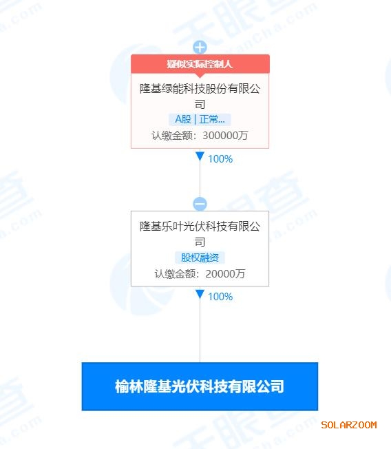 天眼查App显示,近日,榆林隆基光伏科技有限公司成立,法定代表人王永丰,注册资本2亿人民币,经营范围包括光伏设备及元器件制造;电子元器件与机电组件设备销售;合同能源管理;太阳能发电技术服务;新兴能源技术研发等。股权穿透图显示,该公司由隆基绿能科技股份有限公司间接全资控股。