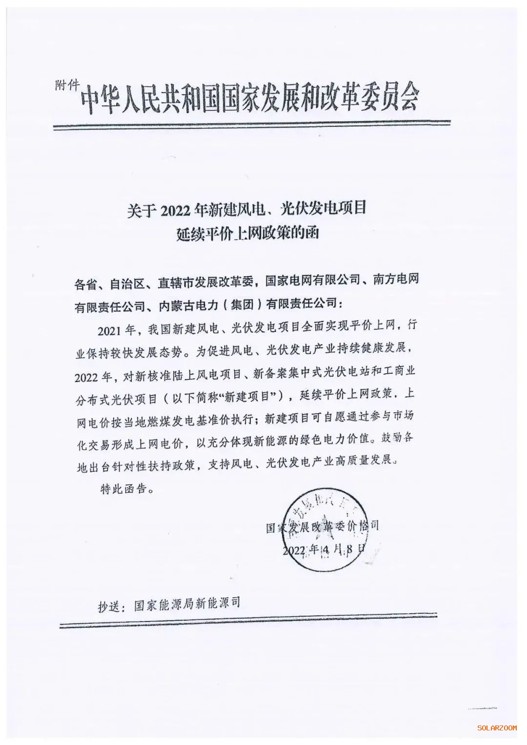 2022年4月8日,国家发改委价格司下发《关于2022年新建风电、光伏发电项目延续平价上网政策的函》,明确: