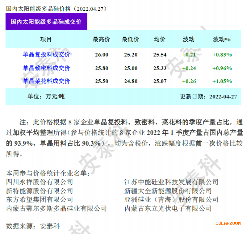 本周国内多晶硅市场成交相对活跃,硅料价格延续小幅上涨走势,其中单晶复投料、单晶致密料、单晶菜花料成交均价涨幅在1%左右。本周各硅料企业陆续开始签订5月份长单,同时也有部分散单、急单以相对高价成交,硅料紧缺程度有增无减,主要原因包括:第一,下游个别切片企业受疫情影响减产,但单晶拉棒生产基本正常,同时新增产能增量继续释放,硅料需求持续增加;第二,硅料企业受疫情运输不畅影响,部分设备到厂时间延后,扩产增量不及预期;第三,部分地区物流受限,导致硅料发货和到货时间延后,下游企业寻找非长期指定供货商临时加单情况增多;第四,进口硅料受检修和疫情的影响尚未恢复,对于国内硅料短缺弥补量不足。以上因素支撑本周硅料价格延续涨势。