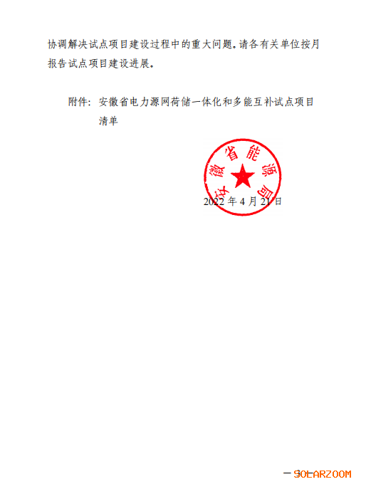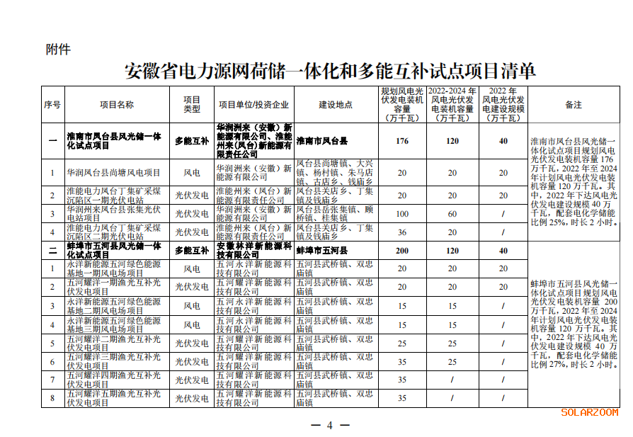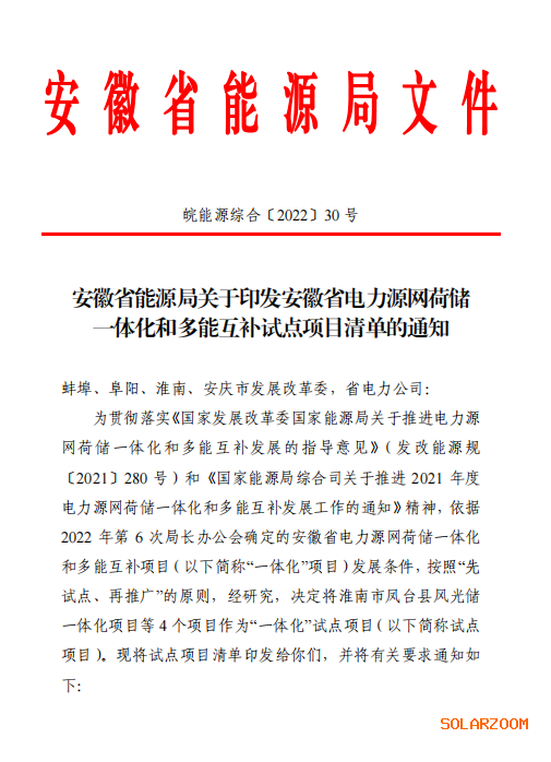 近日,安徽省能源局关于印发安徽省电力源网荷储一体化和多能互补试点项目清单的通知将淮南市凤台县风光储一体化项目等 4 个项目作为“一体化”试点项目(以下简称试点项目)。