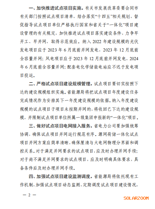 根据要求,纳入 2022 年建设规模的光伏发电项目应于 2023 年 6 月底前并网发电,2023 年 12 月底前全容量并网;风电项目应于 2023 年 12 月底前并网发电,2024年 6 月底前全容量并网;配套电化学储能电站应不迟于发电项目投运。