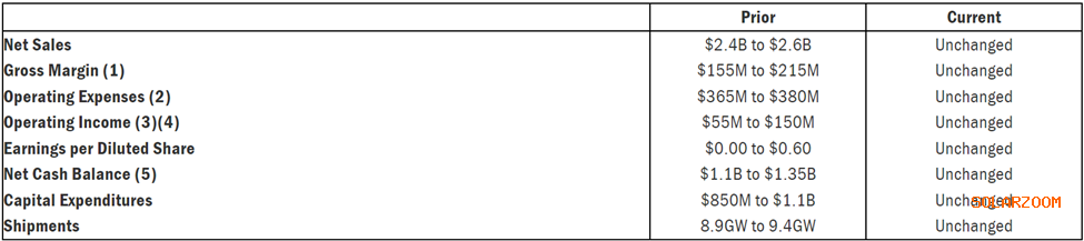 Widmar重申,First Solar公司今年的指导值没有变化。预计净销售额介于24-26亿美元,组件出货量介于8.9-9.4GW。
